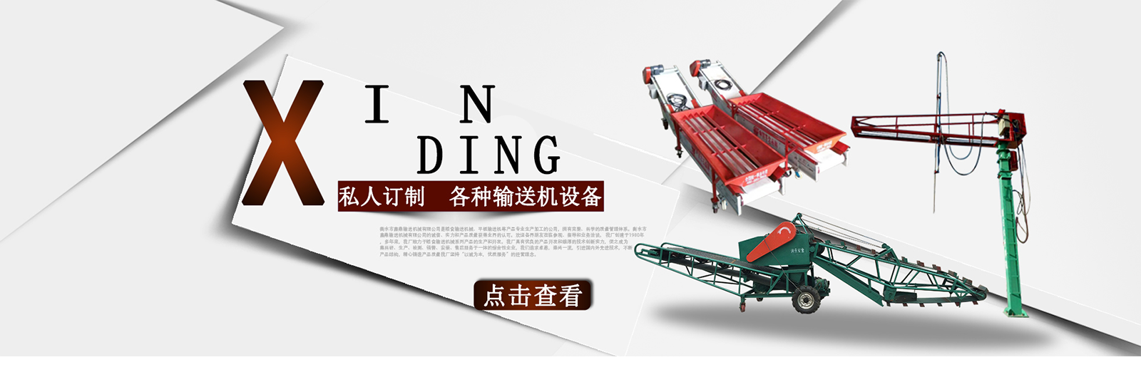 衡水市鑫鼎輸送機(jī)械有限公司是糧食輸送機(jī)械、平板輸送機(jī)等產(chǎn)品專(zhuān)業(yè)生產(chǎn)加工的公司,擁有完整、科學(xué)的質(zhì)量管理體系。衡水市鑫鼎輸送機(jī)械有限公司的誠(chéng)信、實(shí)力和產(chǎn)品質(zhì)量獲得業(yè)界的認(rèn)可。歡迎各界朋友蒞臨參觀、指導(dǎo)和業(yè)務(wù)洽談。 我廠創(chuàng)建于1980年,多年來(lái),我廠致力于糧食輸送機(jī)械系列產(chǎn)品的生產(chǎn)和開(kāi)發(fā)。我廠具有優(yōu)良的產(chǎn)品開(kāi)發(fā)和雄厚的技術(shù)創(chuàng)新實(shí)力,使之成為集科研、生產(chǎn)、檢測(cè)、銷(xiāo)售、安裝、售后服務(wù)于一體的綜合性企業(yè),我們追求卓越,崇尚一流,引進(jìn)國(guó)內(nèi)外先進(jìn)技術(shù),不斷產(chǎn)品結(jié)構(gòu),精心鑄造產(chǎn)品質(zhì)量我廠堅(jiān)持“以誠(chéng)為本,優(yōu)質(zhì)服務(wù)”的經(jīng)營(yíng)理念。。積極拓展市場(chǎng),贏得了廣大客戶(hù)的信賴(lài)和一致好評(píng)。產(chǎn)品暢銷(xiāo)山西、山東、遼寧、黑龍江、吉林、北京、天津、內(nèi)蒙古等28個(gè)省、市、自治區(qū)。